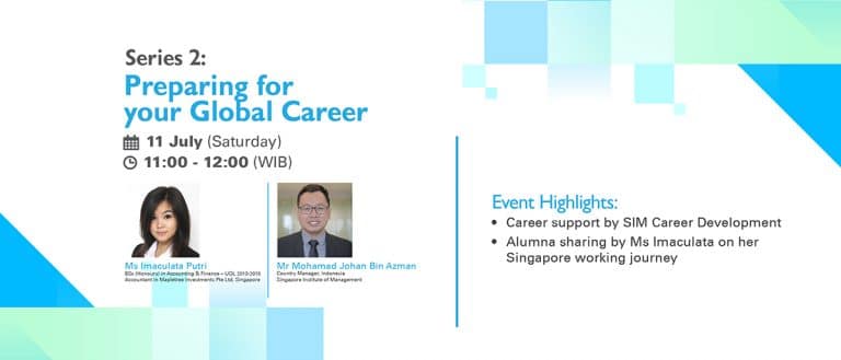 For the 2nd series, let us give you some tips on preparing for your global career! Event Highlights: - Career Support by SIM Career Development - Alumna sharing by Ms Imaculata on her Singapore working journey