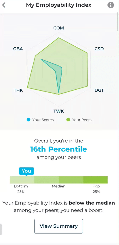 CareerSense empowers you to gain self-awareness of your career values, interests, personality, and skills (VIPS), guiding your choice of careers and job roles that align with your profile. This innovative tool goes beyond traditional career assessments, offering a comprehensive assessment of your skills, experiences, and potential contributions in the workforce against your peers. With CareerSense’s Employability Index feature, you’ll gain valuable insights that empower you to make informed decisions, capitalize on your strengths, address areas for improvement, and stay ahead of the competition in today’s dynamic job market.